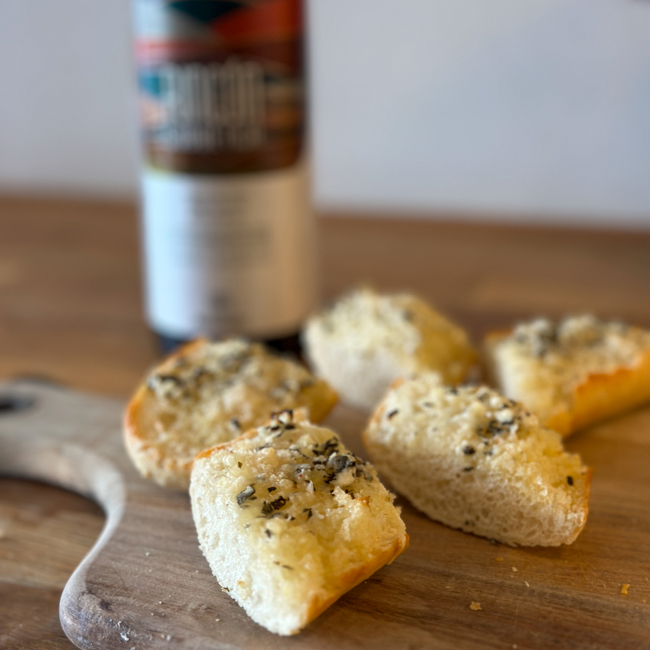- Legg brødet på en stekeplate med bakepapir, pensle med litt smør og legg hvitløksoljen over.